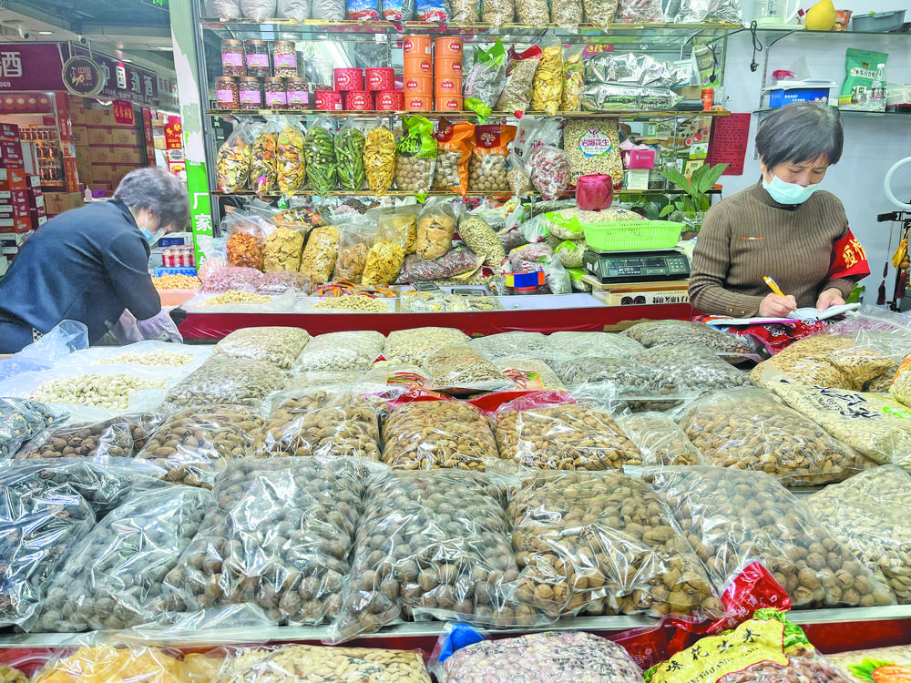 副食品攤位上干果炒貨豐富。 “老板,這個(gè)開(kāi)心果怎么賣(mài)?”“原味瓜子給我稱(chēng)兩斤!弊蛉丈衔9時(shí)左右,在副食品市場(chǎng)一樓,市民王女士正在給家人挑選愛(ài)吃的干果炒貨。記者看到,商鋪內(nèi)開(kāi)心果、夏威夷果、花生、瓜子等堆積成一個(gè)個(gè)小山包,等待顧客前來(lái)購(gòu)買(mǎi)。眼下,天氣轉(zhuǎn)冷,春節(jié)臨近,市面上的干果炒貨類(lèi)食品也迎來(lái)了熱銷(xiāo)季。經(jīng)營(yíng)戶方飛告訴記者,最近來(lái)買(mǎi)干果炒貨的消費(fèi)者漸漸多了起來(lái)!肮献、花生、開(kāi)心果等都是市民愛(ài)吃的東西,買(mǎi)的人也多,我每天能賣(mài)掉幾百斤。”方飛說(shuō),為了滿足消費(fèi)者多元化需求,今年干果炒貨還推出了許多新產(chǎn)品,如陳皮味瓜子、云南七彩花生等,估計(jì)12月前后將迎來(lái)干果炒貨的銷(xiāo)售高峰。 記者了解到,受干旱天氣等因素的影響,今年瓜子、豆類(lèi)等產(chǎn)量減產(chǎn)明顯,價(jià)格比往年有所上漲。方飛說(shuō):“以開(kāi)心果為例,去年的進(jìn)貨價(jià)格在35元一斤,今年就漲到了45元一斤,品質(zhì)較好的開(kāi)心果價(jià)格漲得更多!睆目傮w上來(lái)說(shuō),今年的干果炒貨比往年都貴。 |
