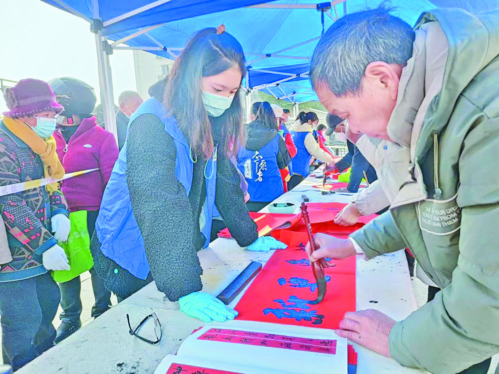 揮毫潑墨寫春聯(lián)。 為弘揚中華優(yōu)秀傳統(tǒng)文化,營造濃厚的節(jié)日氛圍,1月8日上午,后宅街道工會、新時代文明實踐所、文化站聯(lián)合街道書法聯(lián)誼會,在凈居路小廣場為群眾書寫春聯(lián),并向沿街商鋪經(jīng)營戶贈送誠信春聯(lián)。活動現(xiàn)場,后宅街道書法聯(lián)誼會成員們熱情高漲、揮毫潑墨,將新春的美好祝福寫進春聯(lián)中。在志愿者的引導(dǎo)下,來往的群眾有序排隊領(lǐng)取,活動現(xiàn)場洋溢著濃濃的年味。 “老師,幫我寫兩副吧,一副貼在店里,另一副就帶回老家貼起來!眮碜院幽系奶K輝在城北路上做廢舊金屬回收生意,一家三口在后宅街道生活近8年了。和去年一樣,今年他決定繼續(xù)帶著承載美好祝福的手寫春聯(lián)回家。 “天增歲月人增壽 春滿乾坤福滿堂”“浙江有禮 信義義烏”小廣場里一副副火紅鮮艷的春聯(lián),既有辭舊迎新的美好愿景,也有以誠為本的經(jīng)營理念。 據(jù)了解,此次活動共書寫春聯(lián)2000余份。后宅街道新時代文明實踐所相關(guān)工作人員介紹說,志愿者們將寫好的春聯(lián)送到了沿街店鋪,在為經(jīng)營戶送去春節(jié)祝福的同時進一步增強他們誠信經(jīng)營的意識。 |