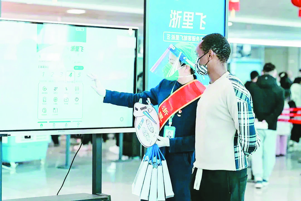 昨日,義烏機(jī)場(chǎng)候機(jī)大廳,一名外商在工作人員的指引下,使用“浙里飛”小程序查詢(xún)航班到港情況。 據(jù)了解,“浙里飛”小程序是浙江省機(jī)場(chǎng)集團(tuán)今年重點(diǎn)推出面向旅客的數(shù)字化改革場(chǎng)景應(yīng)用。該平臺(tái)整合全省七大運(yùn)輸機(jī)場(chǎng),構(gòu)建統(tǒng)一的線上服務(wù)入口和用戶(hù)體系,融合乘機(jī)出行、地面交通、咨詢(xún)幫助、商業(yè)服務(wù)等80余項(xiàng)服務(wù)功能,實(shí)現(xiàn)乘客從“家門(mén)—艙門(mén)—家門(mén)”的全流程便捷式智慧服務(wù)。 |