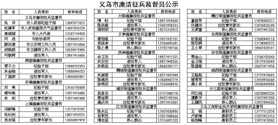 為深入貫徹黨風(fēng)廉政建設(shè)有關(guān)要求,維護(hù)廣大應(yīng)征青年的合法權(quán)益,增強(qiáng)征兵工作透明度,自覺接受社會(huì)監(jiān)督,保證全市征兵工作公開、公平、公正,現(xiàn)將廉潔征兵監(jiān)督舉報(bào)方式和義烏市廉潔征兵監(jiān)督員予以公布,歡迎社會(huì)各界對(duì)征兵工作進(jìn)行監(jiān)督。 浙江省軍區(qū):浙江省杭州市南山路140號(hào)浙江省軍區(qū)紀(jì)委〈收〉,郵編310002,舉報(bào)電話:0571-87342291、15557175981。 金華軍分區(qū):金華市李漁東路2206號(hào)金華軍分區(qū)政治工作處組織紀(jì)檢組〈收〉,郵編321015,舉報(bào)電話:0579-82536315、13173840715, 義烏市人武部:義烏市城中北路205號(hào)紀(jì)委〈收〉,郵編322000,舉報(bào)電話:0579-85523581,13095875012。 廉潔征兵監(jiān)督員作為兼職監(jiān)督人員,主要履行群眾監(jiān)督職能,配合省征兵辦公室及相關(guān)紀(jì)檢監(jiān)察部門開展工作,及時(shí)發(fā)現(xiàn)、指出并參與糾治發(fā)生在群眾身邊的基層征兵“微腐敗”“暗腐敗”問題。如發(fā)現(xiàn)任何征兵違法違紀(jì)線索或廉潔征兵問題,可直接向廉潔征兵監(jiān)督員進(jìn)行舉報(bào)反映。 |