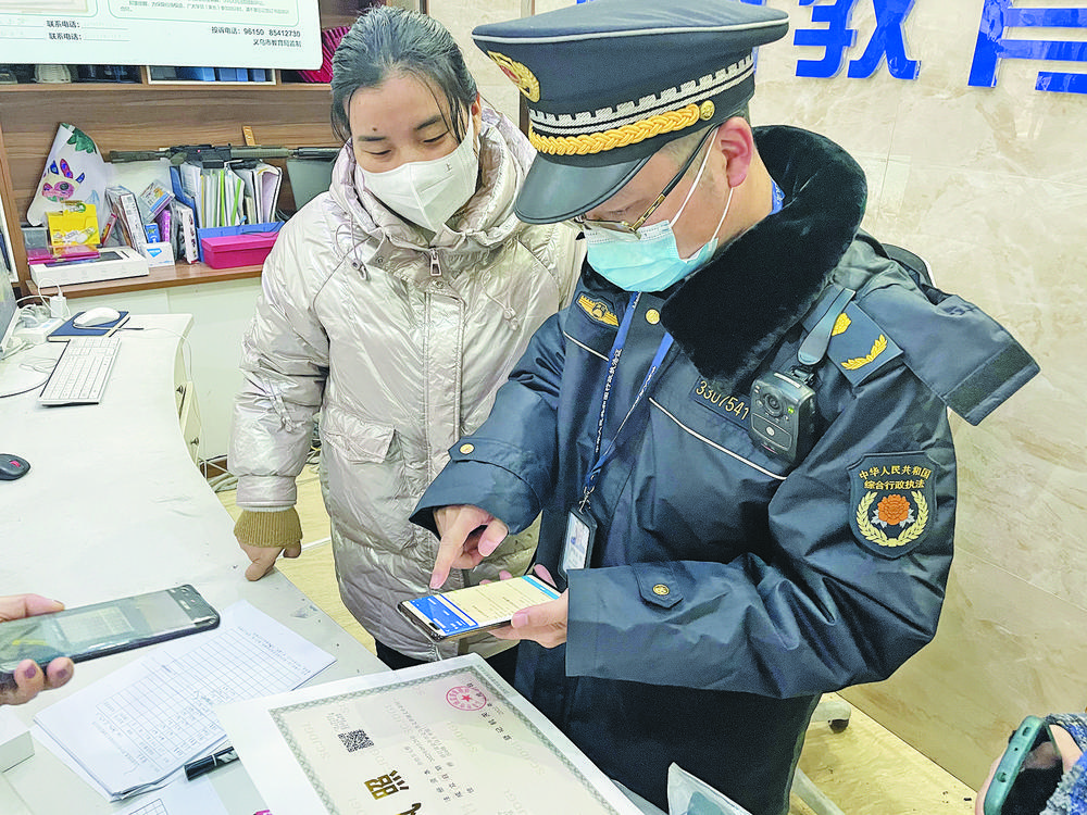 眼下,全市各中小學(xué)已進(jìn)入開學(xué)季。連日來,市執(zhí)法局義亭大隊聯(lián)合教育、市場監(jiān)管等部門,根據(jù)“校外培訓(xùn)機(jī)構(gòu)”監(jiān)管一件事檢查清單,對轄區(qū)13家藝術(shù)培訓(xùn)機(jī)構(gòu)進(jìn)行拉網(wǎng)式排查,推進(jìn)校外培訓(xùn)機(jī)構(gòu)規(guī)范有序。圖為執(zhí)法人員現(xiàn)場檢查藝術(shù)培訓(xùn)機(jī)構(gòu)。 |