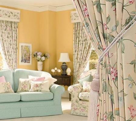 搭配點評:米色玫瑰花圖案的窗簾,圖案以花藤為主,感覺清新淡雅。搭配同色系的墻面顏色和淡藍色以及窗簾同款布藝的沙發(fā)非常和諧。