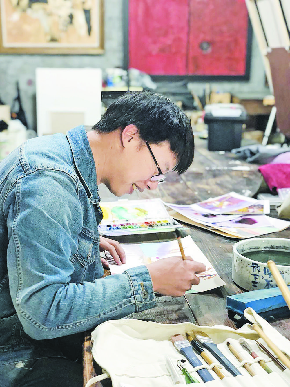 義烏之心南門咖啡館里,油畫家樓健森喜歡坐在吧臺一側(cè)的拐角處,聞著咖啡香味、聽著各色音樂、感受生活氣息、沉淀藝術(shù)感悟……這里就是他創(chuàng)作的一方天地。當記者如約見到樓健森時,映入眼簾的正是這樣一幕,既獨特又和諧。 樓健森,大陳鎮(zhèn)溪后村人,金華市美術(shù)家協(xié)會會員、浙江省油畫家協(xié)會會員。近年來,他創(chuàng)作的《塔影》《春》《盛世安寧10》《商城印象5》等多幅油畫作品先后入選浙江省級美術(shù)作品展;《平凡而偉大》入選慶祝中國人民解放軍建軍95周年全國美術(shù)作品展覽暨第15屆全軍美術(shù)作品展。值得一提的是,作品《春風(fēng)又綠江南岸》接連入選“2020上海油畫作品展”“萬象更新——2021浙江省油畫作品展”“詩意江南——2022中國油畫作品展”。 “我是一個1981年生的未婚單身大叔!睒墙∩χf,他給自己的畫像是一個不自律沉迷于畫畫的人、一個目標驅(qū)動型的理工科男、一個物欲極低的理想主義者。 緣起一萬小時定律 與很多畫家從小開始學(xué)習(xí)繪畫不同,樓健森是“半路出家”,進入大學(xué)校園后,他才開始系統(tǒng)地進行繪畫基本功練習(xí)。 “我學(xué)的專業(yè)是服裝設(shè)計與工程,這當中,現(xiàn)代抽象藝術(shù)奠基人——瓦西里·康定斯基提出的構(gòu)成主義深深影響了我,甚至很大程度上奠定了我的繪畫基調(diào)。” 大學(xué)畢業(yè)后,他一度入世多個行業(yè)。“做策劃時,我常;ㄙM一兩個小時,只為給每一位客戶發(fā)送節(jié)日祝福短信。但這并不是我想要的生活。”回首過往,樓健森感慨。 當自由撰稿人的理想職業(yè)幻滅后,他拿起了久違的畫筆。“2015年初,好奇于繪畫滿一萬小時后會怎樣,我開始練習(xí),這就是現(xiàn)今一切的起點……” 從堅持練習(xí)速寫和人像開始,畫墻繪、畫水彩,樓健森一步一個腳印,在繪畫的道路上穩(wěn)步前進。2017年底,他接觸了油畫,至此便愛上了這一表達形式。 攪攪攪、抹抹抹、擦擦擦………畫畫的時間總是過得特別快,一上午就糊了幾個色塊。在他的朋友圈里充斥著這樣的文字,記錄著他執(zhí)著油畫的過程:物理世界里,一直在“住處—星巴克—畫室”間來來回回;畫畫時最吸引人的狀態(tài)就是沉浸忘我,進入一個與世隔絕的平和之境,欲望和紛擾都被摒除在方寸之外;此間沉靜,唯畫與我。 2019年3月,進行主觀色調(diào)控制練習(xí),4個月后,進入色彩感知練習(xí);2020年,學(xué)習(xí)外國現(xiàn)當代藝術(shù)理論知識;2021年,用時兩月嘗試直覺與感性的融入……2021年,為了達到“運刀如臂使指”的狀態(tài),他不斷追求對身體的控制,曾用時半年反復(fù)練習(xí)小篆,一口氣寫兩小時,一天三四千遍臨摹,幾乎成為常態(tài)。畫了12幅大小不等的油畫,iPad上練習(xí)了512幅色彩小稿……2022年個人總結(jié)中,他這樣寫道。 講究必然與偶然的邂逅 創(chuàng)作如爬山,一步一臺階,萬步云梯上。樓健森的油畫作品已形成鮮明的特點,塊面化構(gòu)圖和五官符號化是他的標簽,呈現(xiàn)出十足的“當代感”。 “塊面,是我的最愛!睒墙∩f。代表作《春風(fēng)又綠江南岸》創(chuàng)作于新冠疫情暴發(fā)期間,他直接拋掉了畫面細節(jié),對塊面進行提煉,通過運用十余種綠色色塊層疊,表現(xiàn)出江南韻味的城鎮(zhèn)建筑,再通過局部小色塊的穿插、呼應(yīng)和對比,帶來園林小景錯落的節(jié)奏感。作品利用厚堆突出油畫肌理,畫面磅礴大氣、蒼勁有力。正如義烏市油委會會長樓志強評價,“作品中所呈現(xiàn)的并非簡單地再現(xiàn)江南的靜怡、恬靜……而是很好地進行了對真實物像的二次創(chuàng)造。用最原始的繪畫單位點、線、面來描繪對園林空間的理解! 對五官符號化表達,樓健森也有著自己的見解:“相比起描繪一人一物本身,我更關(guān)注的是畫面中各要素間紛雜的關(guān)系以及由這些關(guān)系交織而成的整體氛圍營造。這樣的氛圍營造訴求下,畫中的人是誰、物是什么便顯得不是特別重要。他們的個體特征被極致地忽略,只保留下人與人、人與物、物與物之間最直觀明確的關(guān)系表達! 《盛世安寧》系列和《商城印象》系列作品便是五官符號化的代表。樓健森對家鄉(xiāng)飽含深情,為創(chuàng)作這些作品,他帶著相機來到國際商貿(mào)城,步入義烏大街小巷,記錄了成百上千個瞬間。 作品《商城印象4》中,“國際商貿(mào)城一區(qū)東”等背景十分醒目,一個快遞小哥正在為經(jīng)營戶送貨,來來往往的人物五官都只是一個個色塊……這些元素集中在一個畫面里,熱鬧繁忙的市場氛圍便躍然而出。作品《盛世安寧10》中,老舊的樓房、街角的紅綠燈、醒目的斑馬線與騎三輪車的送貨人交織組合成一個整體,安寧滿足的感覺撲面而來。 樓健森的油畫多為小幅作品,長寬尺寸集中1.2米—1.5米之間,但他的創(chuàng)作理念卻一直在更新改變。從學(xué)習(xí)研究尤恩·厄格羅,到沉迷于尼古拉·德·斯塔埃爾,再有感于良師兼益友——藝術(shù)家戎科軍的啟發(fā),他從追求繁復(fù)而精密理性的設(shè)計慢慢轉(zhuǎn)變?yōu)樽非笮问奖澈笊畈氐穆曇、情緒和感受的形色和質(zhì)感,“越來越講究必然與偶然的邂逅”。 畫如人生,人生如畫!拔覍κ澜纭ψ约旱恼J識一直在改變,我的畫也會隨著這種認識