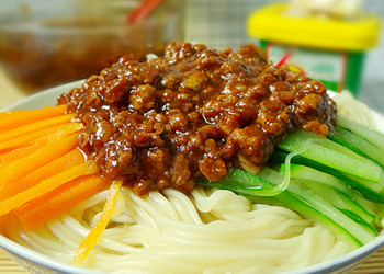 原料:堿面一斤,黃瓜一根,胡蘿卜半根,綠豆芽一百克,肉糜200克,蒜子六個,姜末一湯匙,蔥伴侶豆瓣醬,甜面醬 做法: 1、先把肉糜和一半姜蒜末炒散,發(fā)白盛出備用; 2、清洗干凈鍋,放食用油,量大概和醬差不多,不喜歡油膩的少一些,把醬放進油里。盛醬的碗兌水沖一下,水備用。用鏟子攪拌,油和醬混合均勻; 3、火開小火,慢慢炒,火要小,炒的要勤,到圖三那樣冒泡泡,再炒三十秒; 4、倒入肉糜混合均勻; 5、把沖醬碗的水到進去(水小半碗),和剩下的蒜姜末,攪拌均勻大火燒開; 6、最小火熬到水沒有,只剩醬和油,期間要不停的攪拌,否則會糊的。關(guān)火,放點雞精或者味精提味即可。 7、將水燒開,面條下入鍋中煮熟; 8、將面條盛出,加入炸醬和菜碼即可。 |