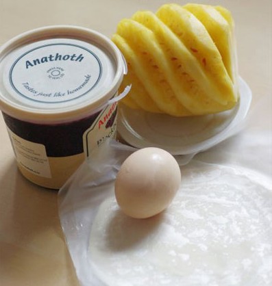 原料:飛餅2張、雞蛋1個(gè)、圣女果3個(gè)、菠蘿2片、其他水果少許、黑莓果醬適量。