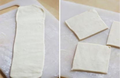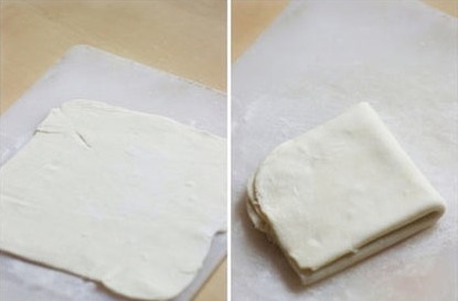 做法: 1、案板上撒一層薄粉,將兩張飛餅重疊,搟成方形; 2、將搟薄后的面皮對折兩次; 3、再次用搟面杖搟成長方形薄片,放入冰箱冷藏松弛30分鐘; 4、將松弛后的長方形薄片切成大小均勻的小正方形;