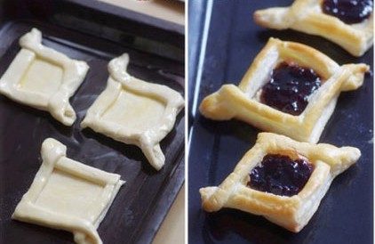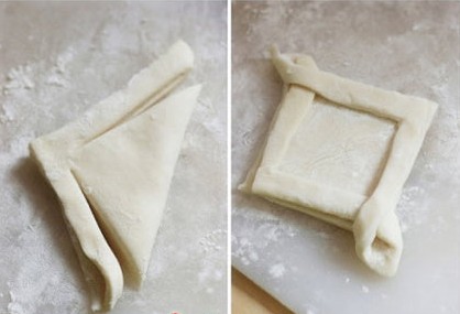 5、將小面片對折,在對折后的三角形兩邊一厘米處各切一刀,不要切斷; 6、然后打開正方形,將對口折成中空的的菱形面皮; 7、將整形后的面皮排入烤盤,刷一層蛋液,烤箱200度預(yù)熱,放入中層,烤約15分鐘; 8、取出烤好的酥皮,刷一層果醬,點(diǎn)綴喜歡的水果即可。