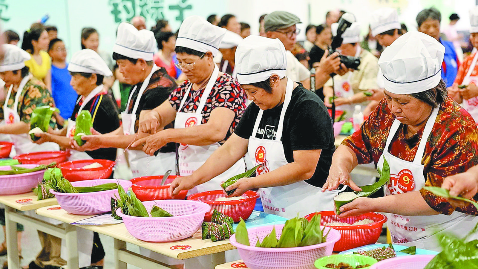 艾香端午鄰里和,萬水千山“粽”是情。6月20日晚,廿三里街道“喜迎亞運、情系端午”鄰里生活節(jié)在后樂文化禮堂熱鬧舉行;顒佑韶ト锝值佬聲r代文明實踐所主辦,廿三里街道婦聯(lián)、廿三里街道總工會、綜合文化站承辦,廿三里街道社工站協(xié)辦。 鄰里生活節(jié)在節(jié)奏明快的大鼓聲中拉開帷幕,來自后樂居、廿三里老年大學的表演隊依次登場,用一個個精彩的節(jié)目,給節(jié)日增添熱鬧氛圍。活動現(xiàn)場設置了包粽子比賽、趣味猜謎、投壺、釣粽子、香囊DIY等環(huán)節(jié)。 最吸引大家目光的是包粽子大賽。提前準備好的蜜棗、糯米、粽葉依次擺開,隨著主持人一聲令下,熱情參與的市民開始捋粽葉、做漏斗狀、填糯米、放蜜棗、壓緊實、封口、扎捆,巧手翻飛。不一會兒,一片片清香的粽葉、一粒粒晶瑩的糯米,在一雙雙巧手下,變成了各式各樣漂亮誘人的粽子。每一個粽子都凝聚著人們過節(jié)的喜悅和對傳統(tǒng)文化的追尋!拔覀儼牟粌H是粽子,更是快樂。”無論是技術(shù)嫻熟的獲獎者還是新手,大家都特別開心,鄰里節(jié)現(xiàn)場歡聲笑語一片。 “釣粽子”場地上,參加活動的市民使用特制釣竿,將釣鉤穿過紙牌粽上的小孔,以此“釣”粽子,游戲難度不大,不少市民滿載而歸。 此外,鄰里節(jié)還融合了廿三里街道總工會“三送”下基層、垃圾分類、防溺水安全教育、防電信詐騙宣傳等內(nèi)容。廿三里街道相關(guān)負責人表示,街道將繼續(xù)發(fā)揮新時代文明實踐志愿服務力量,利用“四大雙千”等活動載體,更切實了解轄區(qū)群眾對文化生活的美好向往,積極營造良好的社會風尚和文化氛圍,為鞏固提升文明城市創(chuàng)建成果和推進現(xiàn)代化美麗城鎮(zhèn)建設作出貢獻。 |