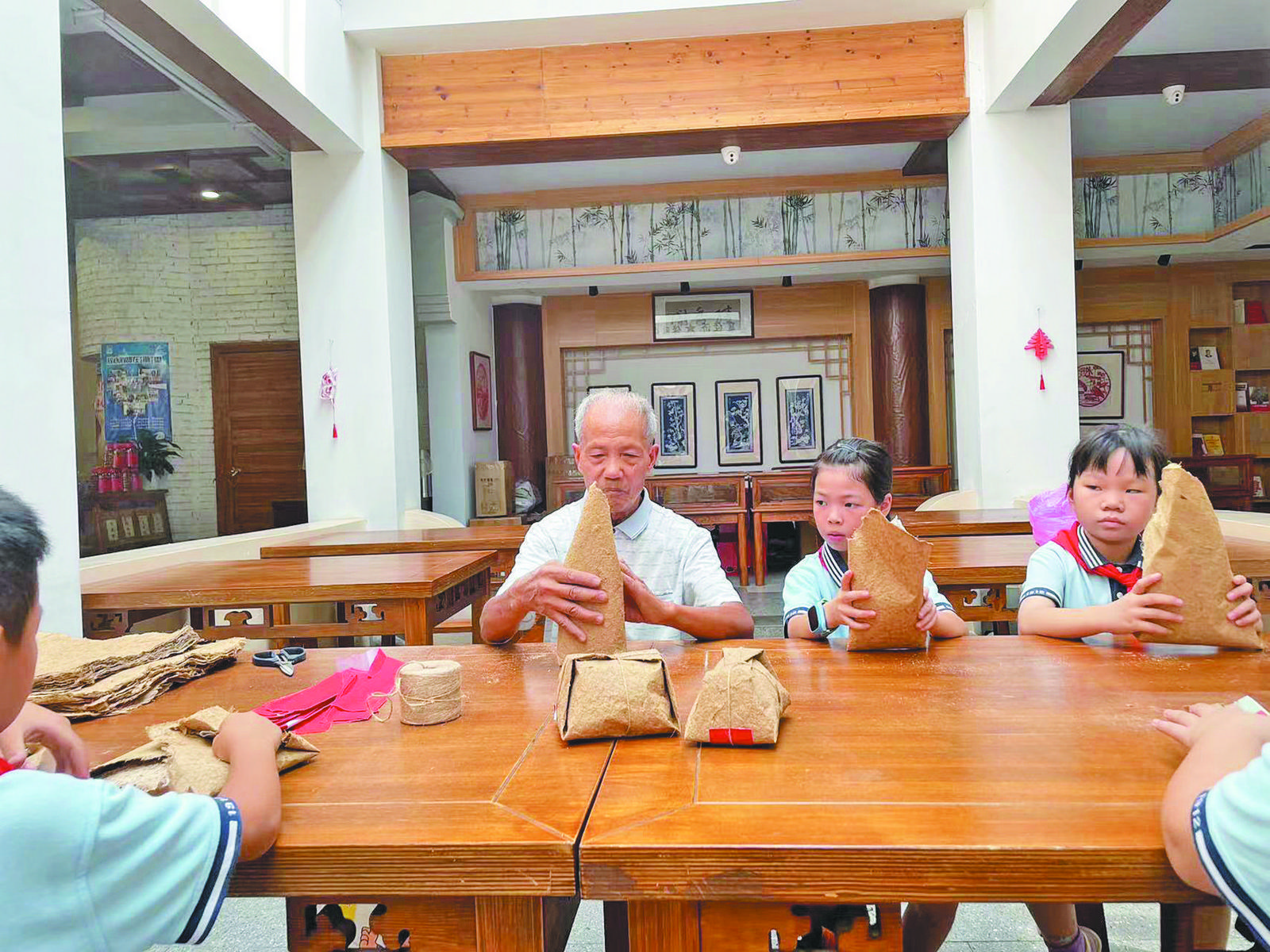日前,為傳承和發(fā)揚義烏傳統(tǒng)風俗文化,繡湖小學(xué)204班的小朋友來到位于佛堂老街上的供銷印象館體驗義烏傳統(tǒng)風俗“包斤頭”。 小學(xué)生們認真聽老師講解“包斤頭”的技術(shù)要點,并在老師的指導(dǎo)下“包斤頭”。只見同學(xué)們正中放一張較為細膩的白紙,然后倒上自己愛吃的零食,取相對兩角并攏折緊,撫出一個平面;然后分別把另外兩個角往上折,于兩頭各折出平整的坡度,直到整個“斤頭”看上去是線條直溜的等腰梯形,再用線捆扎,一份承載了滿滿祝福的“斤頭”就包好了。 |