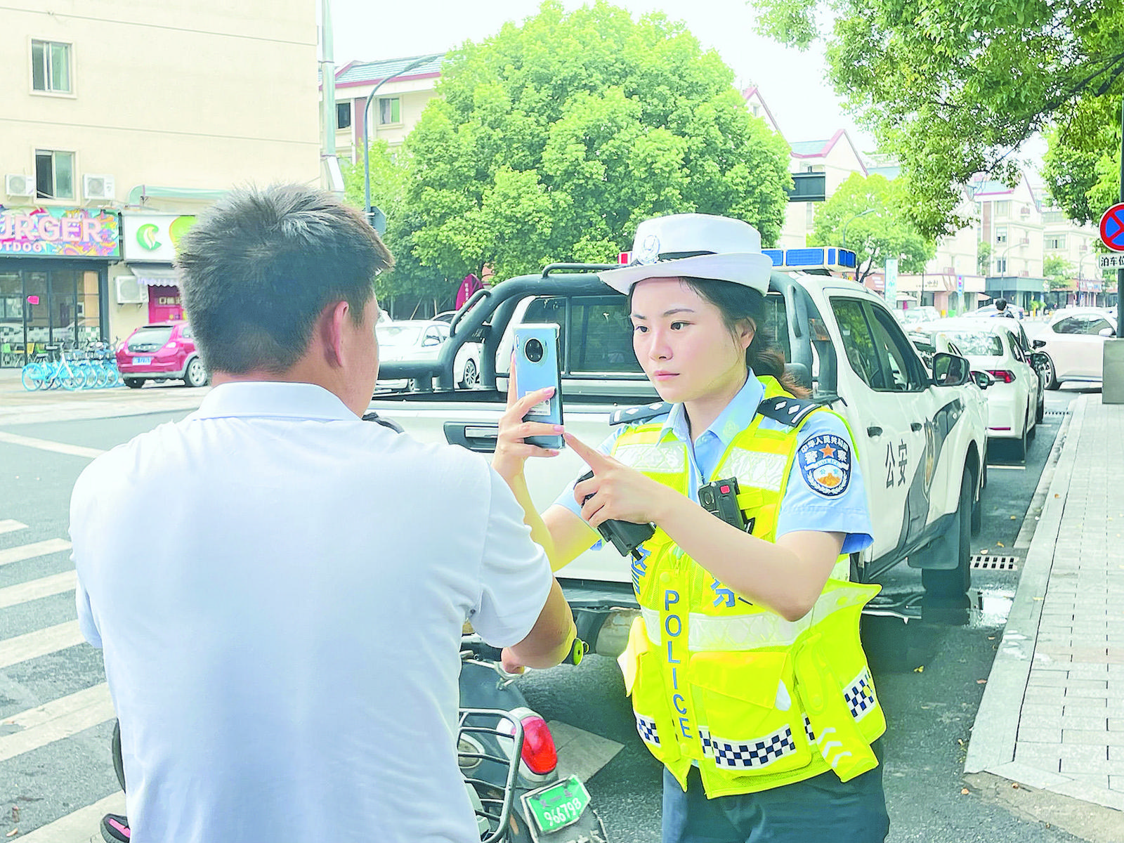 盛夏季節(jié),地表溫度直逼40℃,7月20日上午8點,處于早高峰的江東路與學(xué)院路路口,來往車輛川流不息,滾滾熱浪持續(xù)升騰。 “電動車往非機動車道這邊開,不要占用機動車輔道。”“頭盔要戴好,為自己的安全負(fù)責(zé)!薄半妱榆嚥荒芊欠ò惭b遮陽傘,請立即靠邊停車。”道路的一側(cè),一道靚麗的風(fēng)“警”線映入人們眼簾,來自市公安局交警大隊江東中隊的民警何炫燕,一刻不停地在路口進行電動車糾違、交通勸導(dǎo)。 一個多小時的時間里,汗水濕了又干,干了又濕,帽檐壓得額頭處出現(xiàn)了紅印,何炫燕摘下帽子,用手在額頭處刮了把汗!霸缟喜亮撕芎竦姆罆袼,現(xiàn)在估計都被我擦沒了!焙戊叛嘈χf。 巾幗不讓須眉。即便進入三伏天,大地開啟“燒烤”模式,但道路上女交警的身影卻格外地堅定有力量。何炫燕2017年進入市公安局站前派出所工作,2021年調(diào)到江東交警中隊,從二線崗位轉(zhuǎn)到一線崗位,對她而言是一種歷練,更是一種挑戰(zhàn)。 平時,何炫燕主要負(fù)責(zé)日常路面糾違工作,包括電動車違法行為整治、對逾期年檢車輛進行處罰等等。有時候,她還要帶隊員前往陽光大道查不系安全帶等違法行為,一站就是半天!霸缤砀叻鍟r段,路面車多人多,一天站6個小時是常事,熱是真的熱!鼻皫滋欤戊叛喔杏X有點頭暈,只匆匆喝了瓶藿香正氣水,又繼續(xù)返回崗位上。 記者了解到,何炫燕剛結(jié)束產(chǎn)假兩個多月,正處于哺乳期。因為工作的特殊性,何炫燕縮短了每天享有的法定哺乳時間!暗米プ〉缆方煌ㄕ蔚年P(guān)鍵階段,天熱是小事,暑期出行車輛多,守護交通是我的職責(zé)!焙戊叛囗斨胰照驹诘缆飞希刻斓募m違量最多時達(dá)到100多輛。高溫下,她那小小的身體里迸發(fā)出無限的能量。 |