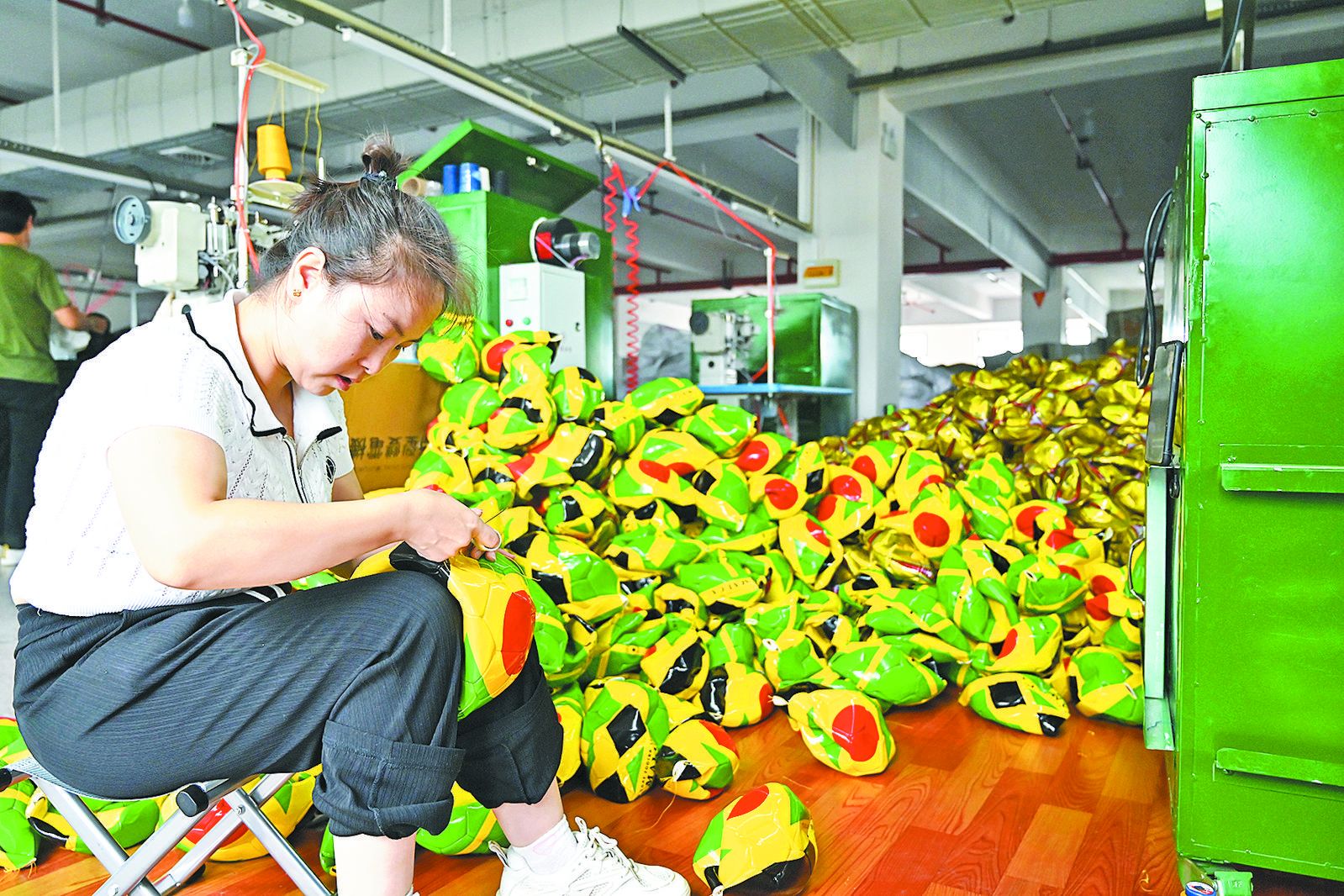 昨日,在義烏市康漫體育用品有限公司車間內(nèi),工人們加班加點(diǎn)趕制足球外貿(mào)訂單。隨著杭州亞運(yùn)會(huì)開幕臨近,體育用品迎來出口熱,公司訂單量同比增長了80%。 據(jù)了解,義烏體育用品行業(yè)外向度高達(dá)75%,主銷中東、非洲、歐美、東南亞、日韓等國家和地區(qū),產(chǎn)品涵蓋國旗、球衣、擺件、熒光棒、助威棒、籃球、足球、乒乓球、跑步機(jī)等各類體育用品及相關(guān)衍生產(chǎn)品。據(jù)義烏海關(guān)統(tǒng)計(jì),今年上半年,義烏出口體育用品35.2億元,同比增長22.5%。 |