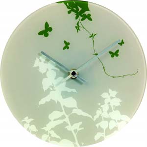 玻璃材質(zhì)清爽自然,白色的花草圖案與綠色花及蝴蝶相映成趣,兩根銀色指針堅守著時間。沒有邊框的設計和清淡色彩適合夏季室內(nèi)裝飾。 |