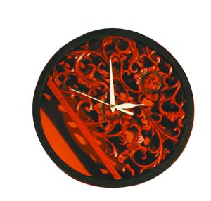黑紅配非常醒目,也是中式裝飾中最常用到的顏色。黑色邊框中間鑲嵌著紅色的鏤空雕花,感覺繁復而優(yōu)美,白色的指針非常醒目。