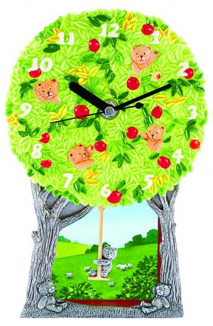 兩棵大樹交會的枝葉成為表盤,幾個小泰迪熊從濃密的葉子中鉆出來摘蘋果。鐘擺上掛著一個蕩秋千的小熊,兩棵樹干之間可當相框使用。