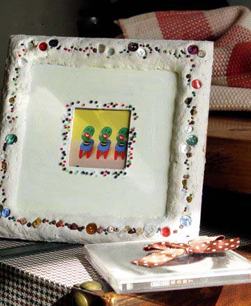 裝幀回憶6款DIY相框 4、質(zhì)樸摩洛哥材料:扣子、小珠子、小石子、紙黏土 用紙黏土捏成條狀粘在普通的相框上,趁未干的時(shí)候粘上扣子、小珠子等裝飾物,要大小錯(cuò)落排開(kāi),并選取不同的色彩。如果要上色,則需要等紙黏土干透再進(jìn)行。 |