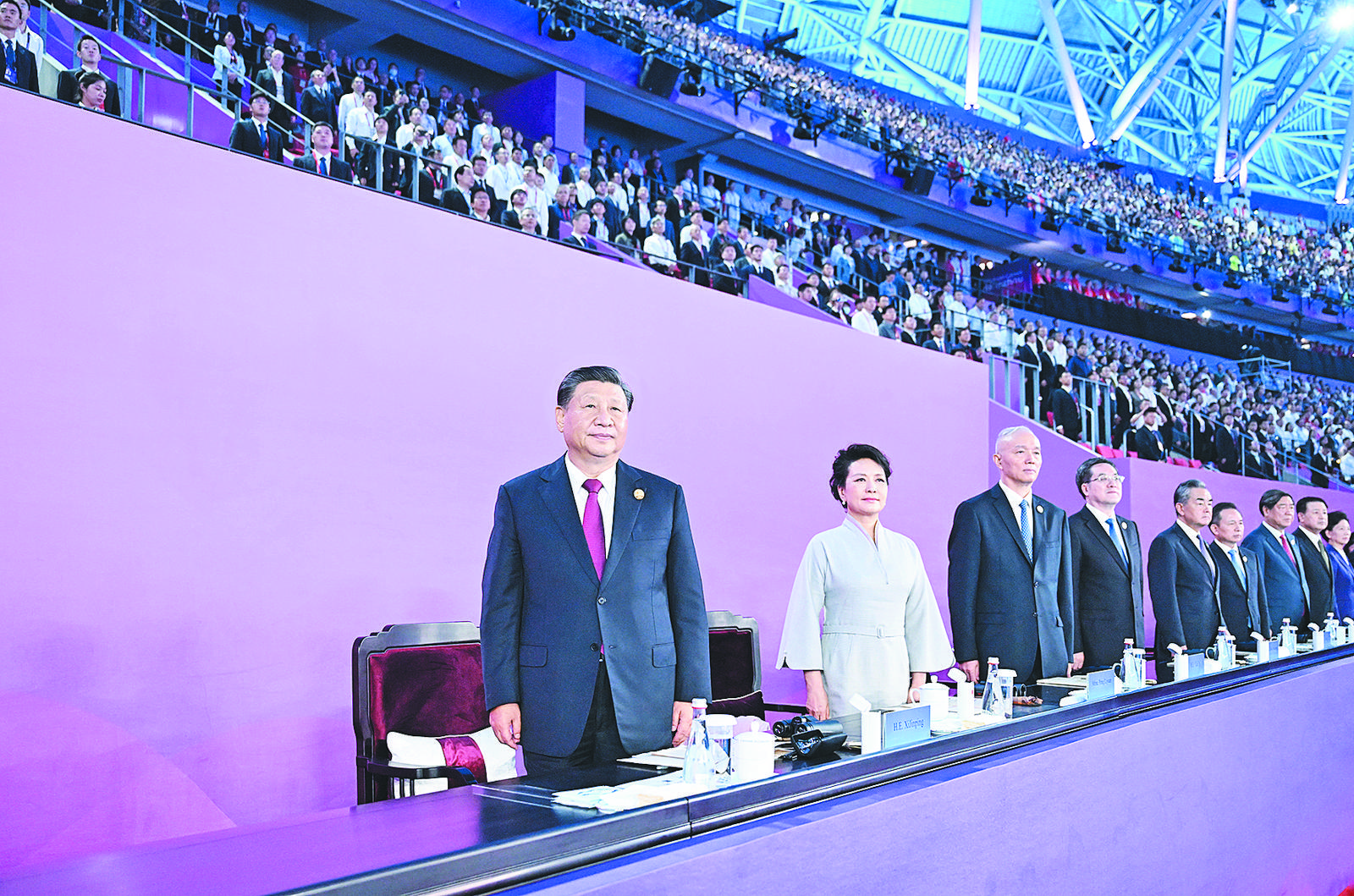 習近平出席開幕式并宣布本屆亞運會開幕 蔡奇丁薛祥 來自亞洲各地的領(lǐng)導人和貴賓等出席 潮涌錢江喜迎盛會,攜手同行共創(chuàng)未來。第十九屆亞洲運動會23日晚在浙江省杭州市隆重開幕。國家主席習近平出席開幕式并宣布本屆亞運會開幕。 蔡奇、丁薛祥,以及來自亞洲各地的領(lǐng)導人和貴賓等出席開幕式。 夜幕下,坐落在錢塘江畔的杭州奧體中心體育場華燈璀璨,流光溢彩。這座形如一朵大蓮花的建筑,見證著亞運圣火第三次在中國點燃。 開幕式開始前,來自浙江各地的群眾帶來富于地方特色的文藝表演,將現(xiàn)場氣氛烘托得十分熱烈。 19時58分,在《和平——命運共同體》的樂曲聲中,習近平和夫人彭麗媛,同亞奧理事會代理主席辛格、國際奧委會主席巴赫等步入主席臺,向觀眾揮手致意。全場響起長時間的熱烈掌聲。 9月23日,恰逢中國農(nóng)歷二十四節(jié)氣中的“秋分”。20時整,迎賓表演《水潤秋輝》在19座“水玉琮”敲擊出的激昂鼓聲中開始。隨著場地中央的倒計時數(shù)字,全場觀眾齊聲呼喊。地屏上,玉琮、玉鳥、神徽等印記與古城遺址一一浮現(xiàn),從碧綠到燦金,展現(xiàn)春耕秋收的自然軌跡,盡顯良渚文明之光、金色豐收之美。 場地中呈現(xiàn)出大好河山的壯闊景象,一條紅綢鋪展開來,伴著《我愛你中國》的深情旋律,8名儀仗兵邁著堅定的步伐,護衛(wèi)著中華人民共和國國旗走進現(xiàn)場。全場起立,高唱中華人民共和國國歌。五星紅旗冉冉升起,迎風飄揚。 20時09分,運動員入場式開始。踏著輕快的樂曲《我們的亞細亞》,來自45個國家和地區(qū)的體育代表團相繼入場,受到全場觀眾的熱情歡迎。《歌唱祖國》的激昂旋律響起,東道主中國代表團最后入場,習近平起身揮手致意,全場一片歡騰,掌聲歡呼聲此起彼伏。中國代表團共1329人,其中參賽運動員886人,將參加本屆亞運會38個大項、407個小項的角逐。 杭州亞運會組委會主席、浙江省省長王浩在致辭中代表組委會和6500萬浙江人民向來自亞洲各個國家和地區(qū)的運動健兒表示最熱烈的歡迎,祝愿他們創(chuàng)造佳績、成就夢想、增進友誼、收獲幸福,讓美妙的杭州亞運之旅終生難忘。 杭州亞運會組委會主席、中國奧委會主席高志丹致辭時表示,在習近平主席和中國政府的親切關(guān)懷與堅強領(lǐng)導下,一屆精彩紛呈的亞運盛會即將拉開帷幕。讓我們弘揚奧林匹克精神,奮力創(chuàng)造亞洲體育新紀錄,合力繪就亞洲命運共同體的嶄新畫卷。 亞奧理事會代理主席辛格在致辭中,向中國政府、中國奧委會、浙江省政府、杭州市政府、亞組委和杭州市民以及所有參與籌備工作的人員致以最誠摯的敬意,稱贊杭州亞運會籌辦工作精彩絕倫,相信參與杭州亞運會的每一個人,都會收獲一段終生難忘的美好記憶。 21時16分,開幕式迎來激動人心的一刻。國家主席習近平宣布:杭州第十九屆亞洲運動會開幕!頓時,全場沸騰,“數(shù)字焰火”絢爛綻放,全場掌聲歡呼聲經(jīng)久不息。 8名我國優(yōu)秀運動員、教練員代表手執(zhí)亞奧理事會會旗入場。伴著亞奧理事會會歌,亞奧理事會會旗徐徐升起,同五星紅旗一道高高飄揚。 運動員鄭思維和孫穎莎、裁判員楊中民和高佳琦分別代表全體參賽運動員和裁判員宣誓。 燈光漸暗,大屏幕上,名為《相約杭州》的短片吸引了全場目光:杭州亞運會會徽穿越時光,在不同年代人們之間傳遞,向世界發(fā)出熱情邀約。 文藝表演《潮起亞細亞》拉開帷幕,表演分為上中下三部分。上篇《國風雅韻》中,國風少年以地為畫、踏墨而舞,宋韻女子亭亭玉立、翩然靈動,游船往來、燈影點點,全景立體影像構(gòu)筑的拱宸橋躍然于大運河之上,展現(xiàn)錢塘繁華和江南風韻的雋永景象。中篇《錢塘潮涌》中,飛旋于空中的演員與潮共舞,“弄潮兒”乘著風帆匯入潮流,吉祥物“江南憶”破水而出、騰躍跳動,激發(fā)起活力澎湃的運動浪潮。下篇《攜手同行》中,“白鷺精靈”遨游星海之中,隨著悠揚的歌聲和清麗的越劇唱腔,數(shù)百名大學生手持發(fā)光金桂點亮綿延悠長的“金桂之江”,亞洲各個國家和地區(qū)的地標性建筑共同呈現(xiàn),構(gòu)成各美其美、美美與共的亞洲畫卷。精彩紛呈的表演,深深打動了現(xiàn)場觀眾。 21時53分,主火炬點燃儀式開始。采集自良渚古城遺址的亞運圣火,自9月8日起在浙江各地傳遞,最終抵達杭州奧體中心體育場。 體育場內(nèi),葉詩文、樊振東、徐夢桃、石智勇、李玲蔚、汪順等6名火炬手接力奔跑,贏得全場熱烈掌聲。與此同時,現(xiàn)場大屏幕上,由超過1億人參與數(shù)字火炬?zhèn)鬟f而匯聚成的“數(shù)字火炬手”,高擎火炬奔赴而來!板X江潮涌”主火炬塔緩緩打開。萬眾矚目中,最后一棒火炬手汪順與“數(shù)字火炬手”一道點燃“錢江潮涌”主火炬塔,亞運圣火熊熊燃燒。 “我們同擁有一個家,心相融、愛相加”“億萬個驕傲的聲音,匯聚成一句話,你和我同住亞細亞”……全場共同演唱杭州亞運會主題歌《同愛同在》,整座體育場化作歡樂的海洋。 出席開幕式的國際貴賓有:柬埔寨國王西哈莫尼、敘利亞總統(tǒng)巴沙爾和夫人阿斯瑪、科威特王儲米沙勒、尼泊爾總理普拉昌達、東帝汶總理夏納納、韓國總理韓德洙、馬來西亞下議院議長佐哈里和夫人諾萊妮,以及文萊蘇丹代表蘇弗里親王
