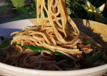 原料:雞蛋2個(gè)、面條300克、小蔥2根、紅青尖椒適量。