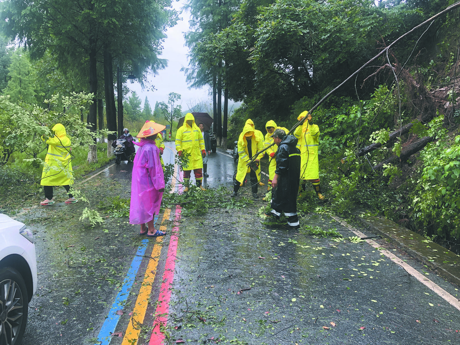 圖為城西街道青年委員帶領(lǐng)青年志愿者,清理道路折倒樹木。