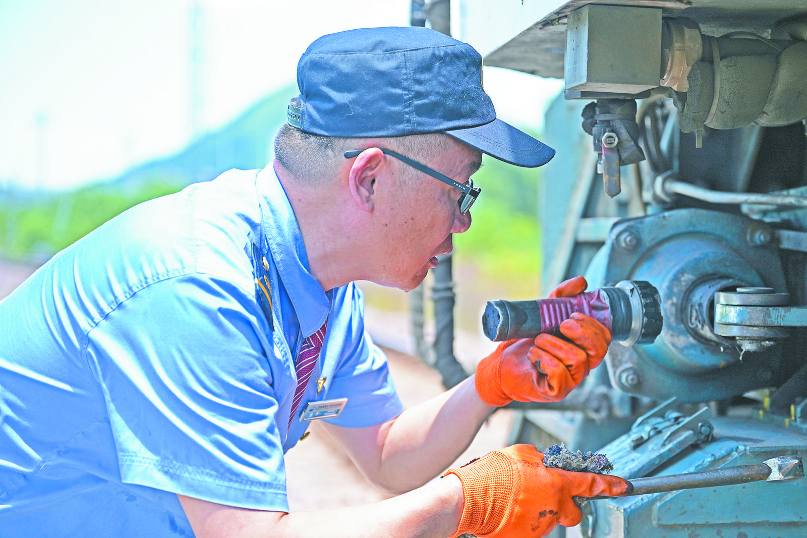 眼下,正值盛夏,午后的義烏鐵路口岸地表溫度,在烈日的炙烤下迅速躥升至40℃,一陣陣熱浪翻滾而來。 “上班前最重要的工作,就是給我的‘老伙計’東風7C—5001號型內(nèi)燃機車做全身‘體檢’!边@段時間,上海鐵路局集團有限公司杭州機輛段駐義烏西站調(diào)機司機長黃偉都要頂著高溫,對機車進行詳細檢查,確保萬無一失。由于暴露在陽光下,一會兒工夫,黃偉的藍色制服就濕透了,豆大的汗珠從臉上滾落。 寒來暑往,給列車“體檢”是個體力活,更是個技術(shù)活。黃偉首先檢查的是車輪,機車地盤距離地面間隙不足1米,黃偉作業(yè)時要貓著腰,一手拿著電筒,一手拿著檢車錘,逐個敲擊機車部件,發(fā)出“鐺鐺鐺”的聲音!奥萁z要是‘哐哐’作響,那可能是螺絲松動了,哪個部位需要檢修!秉S偉把檢車錘給記者,讓記者試試。敲擊的時候,記者發(fā)現(xiàn)幾乎每個螺絲上都有敲痕。黃偉說,這些敲痕是多年檢查敲擊留下的。正是這樣多年如一日的檢查,保障了每趟“義新歐”中歐班列順利發(fā)運。 花了近30分鐘,機車“體檢”完畢。記者跟隨黃偉踏上機車,開始正式的調(diào)機工作。“綠閃,啟動,方向手柄前進位……”黃偉念出口令,配合手勢,機車緩緩啟動。 “義新歐”中歐班列開行十年來,黃偉每天的工作是編組班列,跑好千里之行的“第一棒”。等龍門吊將集裝箱吊裝完畢,黃偉再把班列從義烏鐵路口岸運送到車站區(qū),交給“下一棒”司機。一趟班列從走出國門到安全抵達,沿途需60多名火車司機接力開行。黃偉說:“我們接力開行,保證了每趟中歐班列準時準點!” |