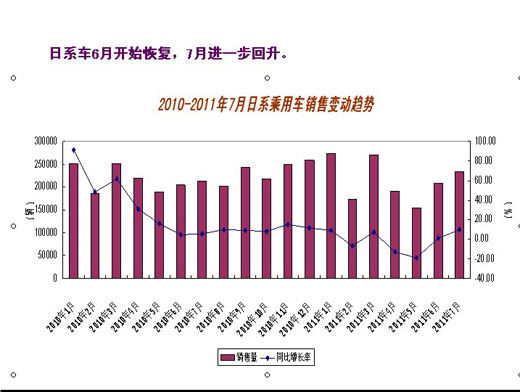 ![]() 7月轎車銷售躍進(jìn)式增長(zhǎng)企業(yè)是一汽豐田和廣汽本田。環(huán)比增長(zhǎng)分別達(dá)到44.79%和33.91%。一汽豐田和廣汽本田全面走出日本地震影響,產(chǎn)量全速恢復(fù),廣本7月更是今年首次沖進(jìn)前十。 ![]()