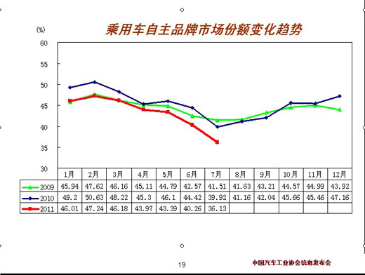 昨日,中國汽車工業(yè)協(xié)會(huì)(以下簡(jiǎn)稱中汽協(xié))發(fā)布了上個(gè)月中國汽車工業(yè)產(chǎn)銷數(shù)據(jù)。2011年7月全國汽車產(chǎn)銷130.61萬輛和127.53萬輛,環(huán)比小降6.96%和11.19%,同比微增1.26%和2.18%。中汽協(xié)秘書長(zhǎng)董揚(yáng)表示:“在政策收緊的情況下,中國汽車工業(yè)經(jīng)歷了上半年的慌亂,目前進(jìn)入穩(wěn)定期。各廠家利用這個(gè)時(shí)期開始調(diào)整管理,內(nèi)部梳理,從這點(diǎn)來說是好事,但是也絕經(jīng)不起更嚴(yán)格的不利政策!薄 ∫黄蟊娦僮灾髌放圃庵貏(chuàng) 去年,上海通用勇奪年度轎車銷量冠軍,強(qiáng)勁勢(shì)頭延續(xù)到今年。7月,一汽大眾以8.71萬輛力壓上海通用的8.34萬輛從第三躍居第一,這也是今年一汽大眾首次領(lǐng)跑?上显乱黄蟊妰H僅超過上海通用3700余輛,而今年1-7月上海通用以63.83萬輛分別領(lǐng)先身后的上海大眾和一汽大眾7萬輛和9萬輛。不出意外,今年中國車市轎車“銷冠”還是上海通用。