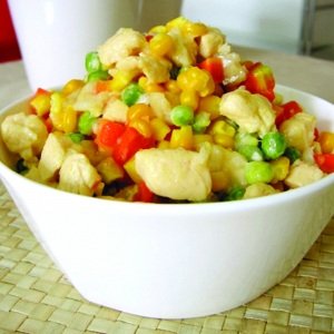 豌豆?fàn)Z玉米 材料:豌豆、玉米粒、胡蘿卜丁、魚(yú)肉、雞肉、鹽,料酒,胡椒粉,淀粉,蔥姜蒜,香油 做法: 1.將豌豆粒、玉米粒用沸水焯一下備用;胡蘿卜洗凈去皮切小。霍~(yú)肉洗凈切小丁,加鹽,料酒,胡椒粉,淀粉上漿;雞肉切小丁備用;蔥姜蒜切末; 2.炒鍋倒油燒至三成熱,下入上好漿的魚(yú)肉滑熟撈出;再把雞肉用同樣的方法滑散撈出; 3.鍋內(nèi)注入油,下入蔥姜蒜末炒香,烹料酒,放入胡蘿卜丁,玉米粒,豌豆粒炒熟,再放入雞肉,魚(yú)肉,清湯,加鹽調(diào)味,用水淀粉勾芡,淋入香油,即可出鍋。 小貼士: 下入魚(yú)肉滑散時(shí),油要多放一點(diǎn)。 點(diǎn)點(diǎn)妹妹:玉米和豌豆搭配在一起,可提高人體對(duì)蛋白質(zhì)的利用價(jià)值哦!