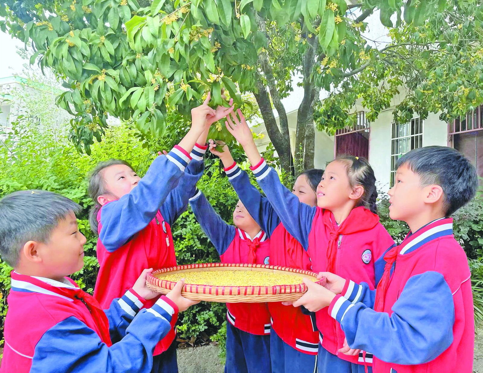 金秋送爽,桂子飄香,義烏各校園里秋意盎然,一系列獨(dú)具特色的秋日活動(dòng)陸續(xù)開展,孩子們?cè)谟H近自然、動(dòng)手實(shí)踐中捕捉秋的蹤跡,收獲成長(zhǎng)的喜悅。 稠江中心幼兒園內(nèi),桂花早已吐露芬芳,處處浸染著清甜的香氣!按蚬鸹▏D!”伴隨著孩子們的歡呼聲,一場(chǎng)熱鬧的打桂花活動(dòng)正式開啟。老師和孩子們一同拿起竹竿,輕輕敲打枝頭,金黃的桂花便如細(xì)雨般簌簌落下,灑在草地上、孩子們的衣服上和發(fā)梢間,構(gòu)成了一幅“桂花雨落人歡笑”的動(dòng)人圖景?諝庵袧M是桂花的甜香,也盛滿了孩子們的快樂。 毛店小學(xué)開展了桂花蜜制作實(shí)踐活動(dòng),將這份桂香化作可留存的美味。在老師指導(dǎo)下,學(xué)生們化身“小匠人”,小心翼翼地采摘桂花,仔細(xì)剔除雜質(zhì),再按照比例逐層加糖、細(xì)心裝瓶。整個(gè)過程中,學(xué)生們專注投入,不僅掌握了桂花蜜的制作技巧,更在親手勞作中感受傳統(tǒng)美食的獨(dú)特魅力,體會(huì)勞動(dòng)帶來的成就感。 前洪小學(xué)的秋日實(shí)踐充滿了創(chuàng)意與巧思,學(xué)生們不僅采摘桂花,還撿拾校園里的無患子,開啟“秋日限定”手工創(chuàng)作。學(xué)生們將桂花與油脂融合制成滋潤(rùn)的桂花唇膏,把無患子研磨加工成環(huán)保的無患子香皂。每一件作品都凝聚著學(xué)生們的想象力與汗水,讓他們?cè)谟H近自然的同時(shí),享受創(chuàng)造的樂趣,獲得別樣的成長(zhǎng)體驗(yàn)。 秋意不僅彌漫在動(dòng)手實(shí)踐的熱鬧中,更沉淀在靜謐的閱讀時(shí)光里。丹溪中學(xué)丹溪園內(nèi),陽(yáng)光透過枝葉灑下斑駁的光影,學(xué)生們安靜地捧著書本,沉浸在文字的世界里。這份獨(dú)屬于秋日的靜謐與詩(shī)意,讓校園更添了一份厚重與美好。 |