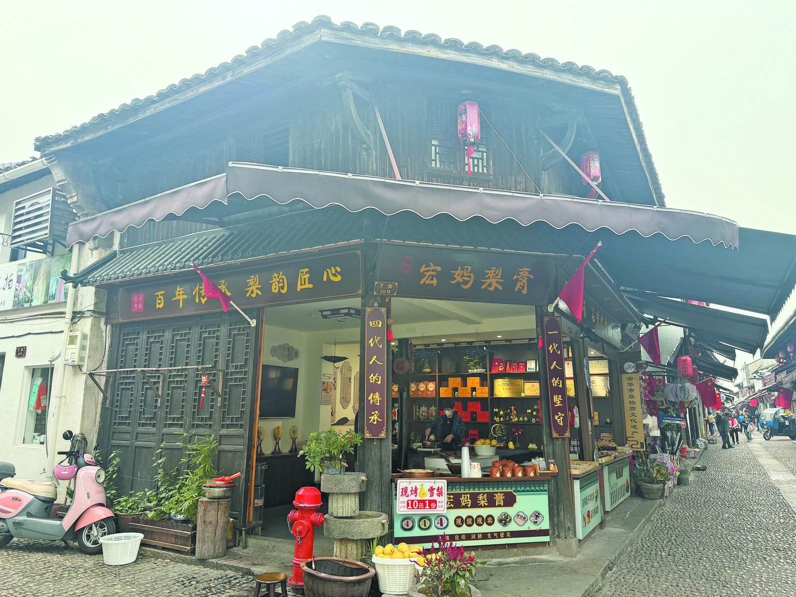 相傳,梨膏糖為唐代名相魏征所創(chuàng)。魏征母親長年飽受咳嗽氣喘之苦,唐太宗派御醫(yī)前往診治,但開出的中藥太苦,老人不肯吃。魏征想到母親愛喝梨汁,就在煎煮梨湯時,悄悄倒入藥汁。誰知一直熬到三更,梨汁因熬煮太久結(jié)成褐色糖塊。魏征拿去請母親品嘗,清苦微甜,老人很是喜歡,連吃數(shù)日病竟然好了。消息傳開,就有了梨膏糖的美名。 梨膏糖制作技藝在義烏由來已久,2019年被列入義烏市非物質(zhì)文化遺產(chǎn)。在佛堂老街牌坊下,就有這樣一家梨膏糖店,它傳承四代,現(xiàn)今“掌門人”是義烏梨膏糖制作技藝代表性傳承人——賈江英,賈氏梨膏糖第四代傳人。這就是“宏媽梨膏”。 古法慢熬出梨膏 11月15日一大早,跟著賈江英的腳步,我們打開了“宏媽梨膏”的店門。賈江英卸下三輪車上的雪梨,就馬不停蹄地開始洗梨、去核、切梨、刨絲。半個多小時后,200斤雪梨全都一絲一絲地躺在不銹鋼大鍋中。打上灶火后,賈江英終于有了歇口氣的時間,“等梨汁沸騰15分鐘左右,就要撈出來進行第一次過濾。”賈江英邊說邊將紗布攤開在另一口大鍋上。 很快,不銹鋼大鍋中冒出熱氣,雪梨的香氣溢滿整個店鋪。賈江英將沸騰的梨汁連著梨肉一塊舀到紗布上,清亮的梨汁滴滴答答地散發(fā)香甜,梨肉則留在了紗布上。等一大鍋梨水舀完,賈江英熟練地拿下墻上的木質(zhì)長柄錘,用力捶打紗布中的梨肉,使梨和汁分離得更徹底。 隨后,賈江英將收集到的一大鍋梨汁用大火快速燒至沸騰后,改用小火慢熬!鞍纠娓嗵亲羁简灥木褪悄托摹!辟Z江英擦了擦額頭的薄汗說道,大火燒開之后,得用文火慢慢熬,把一大鍋煮成一小鍋,當中要過濾兩次。 此時,賈江英拿出一口精致的小銅鍋,笑著說:“我們賈氏梨膏糖色澤清亮的關鍵在于這口銅鍋。”她介紹,“從我爺爺開始,就使用銅鍋來熬制梨膏。”因為銅鍋又重又貴,賈江英也嘗試過使用不銹鋼鍋、不粘鍋來熬制梨膏,但明明是一樣的手法,用其他鍋熬出來的梨膏,色澤就沒有這么漂亮。賈江英認為,可能這就是老祖宗的智慧吧。 用小鍋熬制過程中,賈江英會時不時攪一攪,觀察膏體的狀態(tài),直到用勺子挑起時,膏體掛勺不滴、能拉出晶瑩的糖絲,顏色呈琥珀色,這才算是真正熬成!爸谱饕粔K梨膏糖,要經(jīng)過洗梨、切梨、壓汁、熬糖、翻砂、澆糖、平糖、切糖等10道工序,看似簡單,卻易學難精。從梨汁下鍋到熬成,最少得十個小時! 賈江英的熬糖手藝是從太公手里傳承而來,在那個沒有溫度計的年代,賈氏幾代人掌握熬糖火候全憑經(jīng)驗。賈江英也學得精髓:“聽鍋里糖漿冒泡的聲音,觀察糖漿氣泡的密度,用木勺稍微蘸一點看看能否拉絲,我就能知道這鍋糖熬好了沒有! 不僅熬糖沒有借助電子控溫,賈江英到現(xiàn)在仍堅持用木質(zhì)搗杵捶打梨肉、用壓榨器榨梨汁、用濾網(wǎng)手工過濾梨汁中的雜質(zhì)、用銅制長勺柄一遍一遍攪拌梨膏……“我會一直堅持這樣的傳統(tǒng)技藝,不圖省力、不求快,確保做出讓客人滿意的梨膏糖!辟Z江英說道。 創(chuàng)新研發(fā)煥新生 賈氏梨膏糖起源于賈江英的太公賈昇金,他制作的“百草梨膏糖”,深受街坊鄰居喜愛。一旦誰家有人咳嗽,旁人會說:“去賈家拿顆糖就好了!”太公去世后,爺爺賈禎棋接手梨膏糖制作,并每天往返于蘭溪“雞毛換糖”,幾乎日日銷售一空。后來,父親賈祥銓傳承技藝,還在梨膏糖中加入中藥材,創(chuàng)新研制出“川貝梨膏糖”。幾代人的努力經(jīng)營,讓賈氏梨膏糖的名聲逐漸傳開,成為新老顧客的心頭好。 賈江英12歲便耳濡目染,學會制作梨膏糖。她雖然堅守傳統(tǒng)技藝,卻不墨守成規(guī)。直至今日,她不斷鉆研技藝、學習品牌建設知識,一步一步成為非遺品牌創(chuàng)始人。 2016年,賈江英來到佛堂老街創(chuàng)立“宏媽梨膏”品牌!鞍哑放泼楹陭專皇且驗樾鹤拥男∶泻陮,二是因為‘宏’字有弘揚的意思,希望梨膏糖技藝能發(fā)揚光大。”賈江英用樸實的語言介紹了創(chuàng)立品牌的初心。 品牌創(chuàng)立之后,賈江英在保留古法精髓的基礎上,努力提升梨膏糖的品質(zhì)和口感。首先是形態(tài),區(qū)別于以前大小不一的梨膏糖,賈江英改進了澆糖、切糖的工具、手法,制作出現(xiàn)在的方塊梨膏糖,每一顆大小均勻,還方便攜帶。此外,她在聽取老顧客的建議后,一趟趟跑市場、跑工廠,購買了一批模具,將梨膏制成各種形狀的棒棒糖,深受孩子們喜歡。去年冬天,賈江英還改良了網(wǎng)紅“烤梨”,在店里推出一款熱飲——銀耳烤梨湯。用來烤的梨就是做梨膏的雪梨,銀耳用的是新鮮銀耳,同樣不加糖,只靠梨子本身的甜味,喝起來清甜潤滑。 老手藝變新“網(wǎng)紅” 過去,梨膏糖的手藝人走街串巷,給大家?guī)嵒萦纸】档睦娓嗵,同時也為市井生活送上一絲甜蜜,F(xiàn)在,梨膏糖代表了一項技藝的傳承,也是兒時美好回憶的寄托。 在賈江英的手機里,收藏著天南海北的客戶微信,自建立品牌、創(chuàng)新產(chǎn)品后,從幾元到幾十元不等的梨膏糖產(chǎn)品,吸引了眾多新老粉絲。 “梨膏具有潤肺止咳、清熱解毒的功效,秋冬季節(jié)氣候干燥,就很適合吃這個!辟Z江英說道,“現(xiàn)在天氣涼快,可以放心寄快遞,所以很多老客戶通過微信下單。隨著佛堂古鎮(zhèn)文旅發(fā)展,現(xiàn)在也常有游客通過‘小紅書’等社交平臺知道