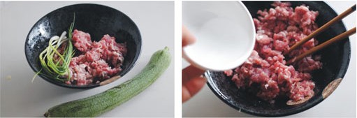 內(nèi)餡原料: 豬肉餡(2:8或3:7)、絲瓜一根。 調(diào)味料: 生抽、水、白胡椒粉、芝麻油、蠔油、糖、鹽、蔥、姜。 做法: 1、準(zhǔn)備材料。 2、將鹽加入肉餡中,再將水分以少量多次的方式加入肉餡中,用筷子沿一個(gè)方向?qū)⑺謹(jǐn)嚾肴怵W中,當(dāng)水分未完全被肉餡吸收時(shí),不要繼續(xù)加水。 3、(肉餡打水完成,肉質(zhì)具有粘性,且色澤變淡)打水后加生抽、蠔油、糖、鹽、蔥、姜泥、白胡椒粉攪拌均勻。 4、加入切碎的絲瓜丁。 5、加入麻油。 6、攪拌拌勻放入冰箱冷藏待用。