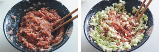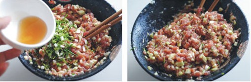 小貼士: 1、將水分以少量多次的方式加入肉餡中,用筷子沿一個(gè)方向?qū)⑺謹(jǐn)嚾肴怵W中,當(dāng)水分未完全被肉餡吸收時(shí),不要繼續(xù)加水。當(dāng)肉餡打水完成,肉質(zhì)具有粘性,且色澤變淡。 2、添加水分即稱“打水”。當(dāng)肉餡水分增加時(shí),可避免肉餡經(jīng)過加熱后變干、變柴,這樣才會(huì)鮮嫩多汁。打水時(shí),加入鹽可以有助于水分吸收。凡是包餡類面食,只要有肉類的都需要打水,差別在于打水量的多少。應(yīng)視肉質(zhì)的吸水情況來定,冷藏后的肉餡,吸水性較高,新鮮肉吸水量較少。打水后會(huì)比原先膨脹且更具粘性。肉餡打水后加調(diào)料和蔬菜,充分結(jié)合所有食材的美味。 3、加麻油除了能加強(qiáng)香氣外,還可以在餡料外形成保護(hù)膜,避免之后加的蔬菜與調(diào)味過的肉餡接觸而出水。 |