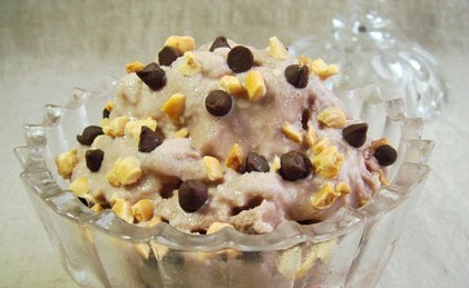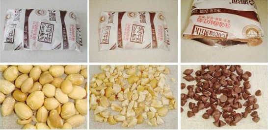 原料: 利樂枕可可牛奶一包、熟花生豆、巧克力豆適量。 做法: 1、把一袋利樂枕的可可牛奶放入冷凍室徹底凍硬后取出; 2、放入微波爐中火加熱25秒; 3、用廚房剪將牛奶齊邊剪開擠入到容器中既是可可刨冰; 4、把熟花生豆的紅衣去掉放入保鮮袋中用搟面杖碾碎; 5、把花生碎、巧克力豆均勻撒在可可刨冰上即可。