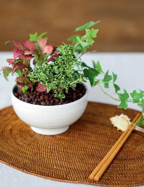 碗中魅力 將三株不同形態(tài)的植物組合在碗中,做成一個迷你組合盆栽,是裝點(diǎn)餐廳的上上之選,無論擺在何處都十分養(yǎng)眼。 步驟: a. 選擇三株葉片形態(tài)不同且色彩不同的植物:常春藤、紅網(wǎng)紋、六月雪。 b. 將它們從培養(yǎng)盆中取出,如果植株較大則需要分根。 c. 按照主次,依次將紅網(wǎng)紋、常青藤和六月雪種到碗中。調(diào)整好位置后將土輕輕壓實(shí),最后填入陶粒增加美觀性。 |