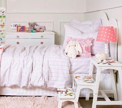 素色條紋和淡粉色床品的搭配,讓空間顯得整潔清新。甜蜜的粉色和純凈的白色作為搭配穿插其間,點綴出女孩臥室的甜蜜感覺。