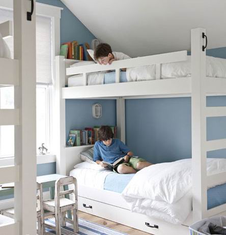 搭配繽紛臥室之藍色 淺藍和淺白的海軍風搭配,是越來越多年輕人近年來的大愛,無論從服飾還是到家居,這整體夏季的吹起了一股清新的海洋之風。這樣的臥室顏色設計,特別適合打造男孩子的兒童臥室空間,白色家具加上藍色的墻面和地毯鋪設,簡單的色彩搭配游戲,就能讓頑皮男孩的房間瞬間明快起來。另外,在閣樓的小戶型里,放置一張不太占空間的雙人木床,也不失為一個很好的兒童臥室搭配選擇。 |