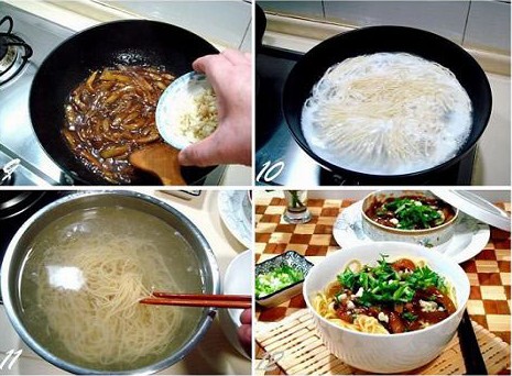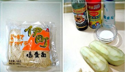原料:細(xì)面300克; 打鹵:去皮茄子350克、大蒜25克、花椒10粒、鹽3克、雞粉2克、醬油10克、烹調(diào)油20克、水淀粉適量。