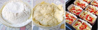 6 裝入紙制蛋糕模中,裝7分滿即可,撒上圣女果干烤箱170度,中層烤20分鐘。 |