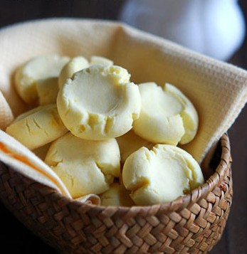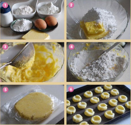 原料: 低筋面粉100克、玉米淀粉100克、無鹽黃油100克、糖粉40克、熟蛋黃2個、鹽1克。 烘焙: 預熱170度,中層,約15分鐘。 做法: 1、黃油室溫軟化,雞蛋煮熟備用; 2、軟化的黃油+糖粉用打蛋器打發(fā); 3、把煮熟的雞蛋剝掉外殼,小心取出蛋黃。蛋黃放入小篩網中用勺子碾碎,篩出細碎的蛋黃屑; 4、玉米淀粉和低筋面粉混合過篩,與打發(fā)的黃油一起拌至無干粉; 5、用手捏成面團放入保險單中,按癟放入冰箱冷藏1小時左右; 6、從冰箱取出冷藏好的面團,60克/個搓成小圓球,排入烤盤中,用食指按出小坑?鞠漕A熱170度,放入中層,烘焙約15分鐘即可。