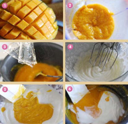 原料: 淡奶油200克、白砂糖25克、芒果泥150克、檸檬汁1/2小勺、鮮芒果粒少許、吉利丁片1片。 做法: 1、芒果切花刀,取下果肉。 2、把芒果果肉放入攪拌機(jī)內(nèi)攪打成泥。 3、吉利丁片泡冰水變軟。芒果果肉+檸檬汁放在爐上適當(dāng)加熱。放入變軟的吉利丁片迅速攪拌至融化。 4、淡奶油+白砂糖打至6分發(fā),出現(xiàn)紋路不會(huì)馬上消失狀。 5、芒果果泥容器可以隔水迅速降溫,用手指感覺(jué)不熱了,放入到淡奶油中。 6、混合攪拌均勻,倒入容器內(nèi)入冰箱冷藏以一晚即可。吃之前點(diǎn)綴新鮮芒果粒裝飾。