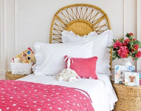 甜美的粉色星空圖案床品,搭配素雅簡潔的白色床單,讓臥室充滿女孩最愛的浪漫氣息。藤編床頭柜的點綴,讓這款房間增添了田園的感覺。