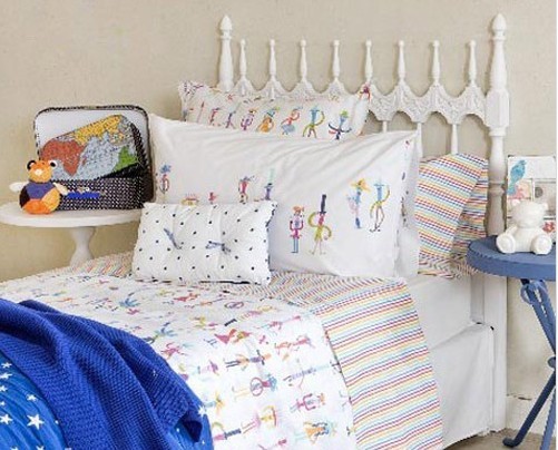 同樣的星空元素,用藍(lán)色作為底色就顯得更加接近夜空了。在白色的床單上用卡通小人和彩色條紋作為點綴,讓素雅中不失童趣,更符合孩子審美的過渡期。
