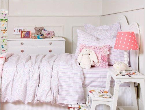 素色條紋和淡粉色床品的搭配,讓空間顯得整潔清新。甜蜜的粉色和純凈的白色作為搭配穿插其間,點綴出女孩臥室的甜蜜感覺。