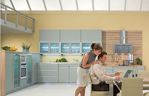 這套淺藍(lán)色櫥柜淡雅舒適,“L”型櫥柜簡(jiǎn)單現(xiàn)代,但功能齊全。櫥柜占地面積不大,開放式結(jié)構(gòu)讓廚房與餐廳結(jié)合完美。寬敞的廚房偶爾也要兼任辦公的責(zé)任。夫妻兩人一起圍著電腦看菜譜一邊一起研究執(zhí)行,這是才是放松的家庭生活。 |