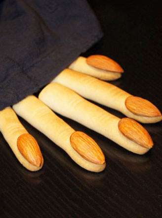 在指尖處粘上一個(gè)美國(guó)大杏仁,輕輕按壓定型,然后用切面刀輕壓關(guān)節(jié)紋
