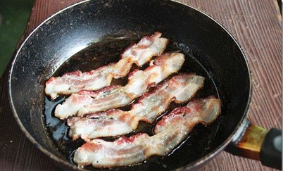 1.培根四根煎至熟就可以了,后面還要烤,所以不用煎到很脆
