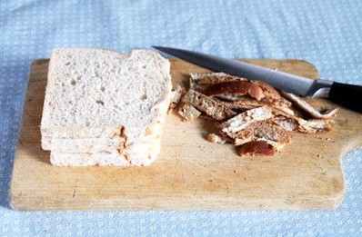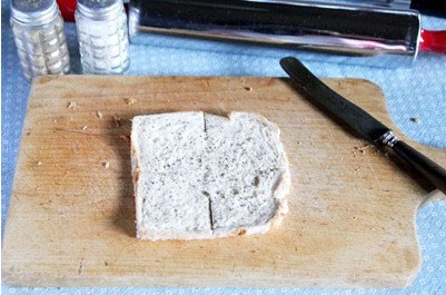 2.切片面包4片,用刀切掉四周的皮。預(yù)熱烤箱375F/190C