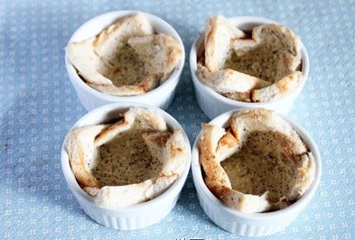 4.準(zhǔn)備4個(gè)烤碗,沒有也可以用烤瑪芬的烤盤。四周底面都涂抹上黃油,面包切口稍微錯(cuò)開重疊一下就可以放進(jìn)烤碗里,稍微壓一壓底面這樣有更多的空間。注意面包的角也要涂抹上黃油,這樣烤出來才好看