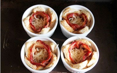 5.將烤好的培根圍在面包里面,像一口井一樣,中間灑上一些芝士,我用的馬蘇里拉芝士。其他芝士也可以。如果喜歡也可以加入一些番茄粒,蔬菜粒,但是不需要太多,考慮后面還要放雞蛋