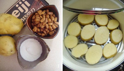 2.土豆洗凈,切成厚片,放入蒸鍋里蒸軟