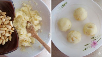 5.然后再把去了殼的松仁倒入土豆泥中攪拌均勻