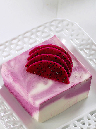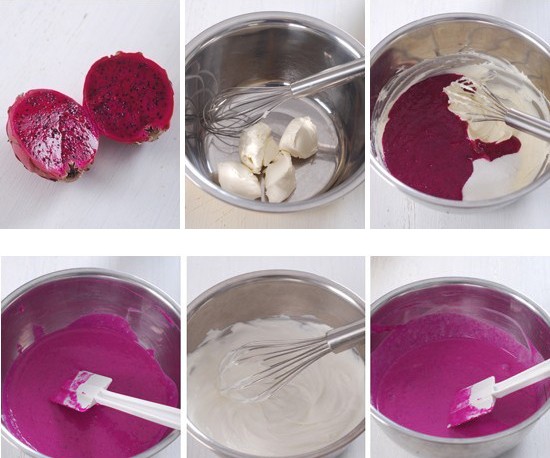 2.紅龍果芝士液(奶油奶酪125g,白砂糖30g,紅龍果泥150g,吉利丁片1片半(5g/片),牛奶50g,淡奶油90g):提前把1片半的吉利丁片涼水泡軟,瀝干放入50g牛奶中隔熱水融化。紅龍果去皮切塊后入料理機(jī)打成泥取150g備用。奶油奶酪室溫軟化,加入糖和紅龍果泥拌勻,倒入吉利丁牛奶液(或者把所有材料直接入料理機(jī)打勻更省事),淡奶油打至6-7分發(fā),倒入剛剛拌好的液里。拌勻即成紅龍果芝士液